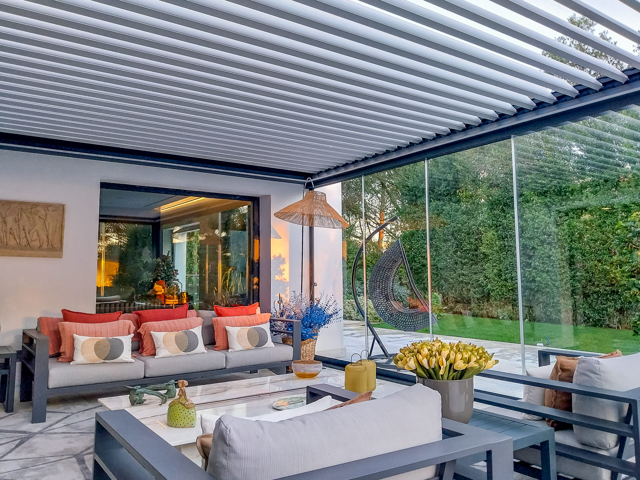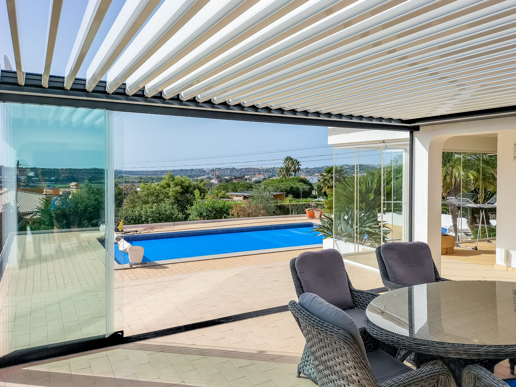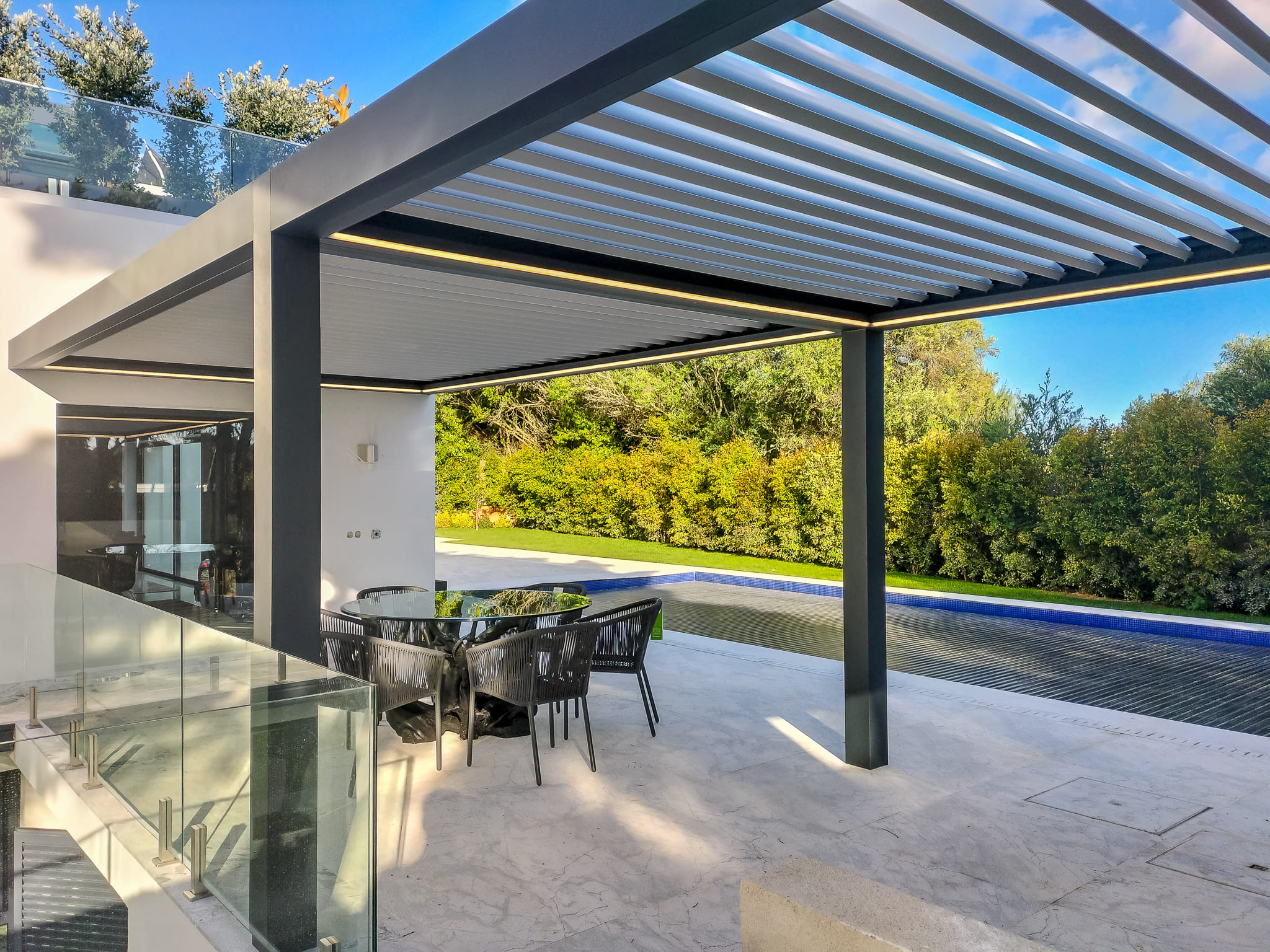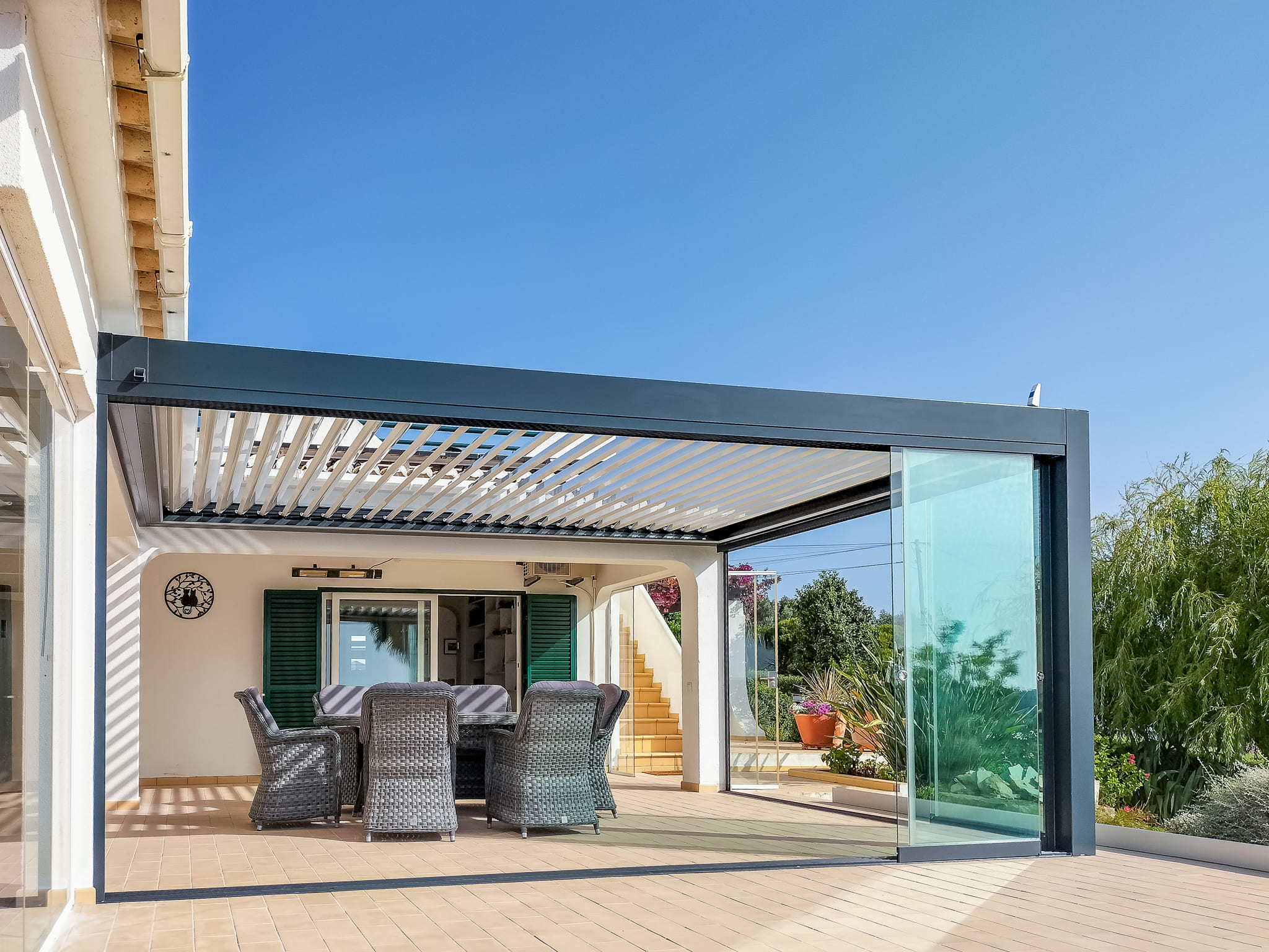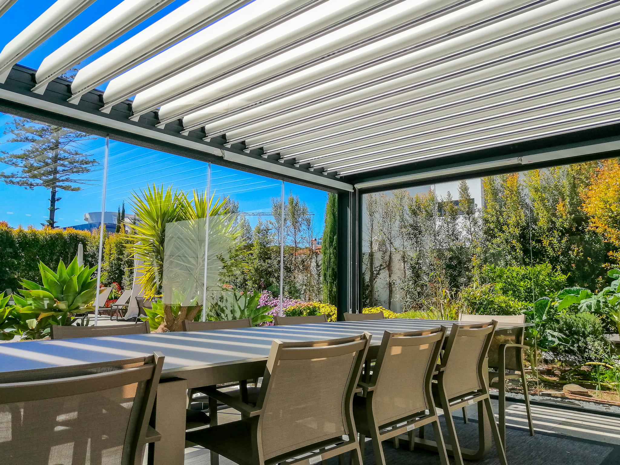 Novo sistema de proteção solar e de chuva, fabricado em linhas direitas. Permite que você desfrute do seu espaço ao ar livre 365 dias por ano. Protegendo com eficiência, da luz solar, chuva, vento, calor ou frio.