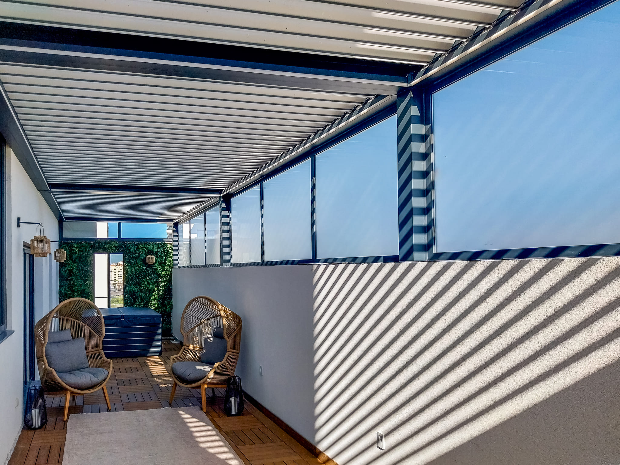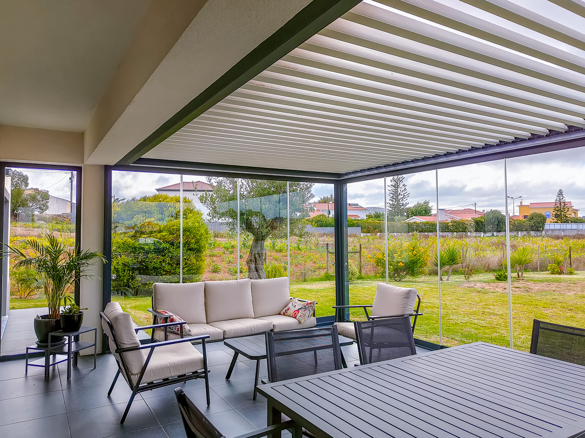 Composta por estrutura robusta e lâminas em alumínio motorizadas e orientáveis, acionadas por controlo remoto. Este sistema fornece aberturas das lâminas de 0º até 135º, permitindo fechar ou ventilar o ambiente como desejado pelo utilizador.